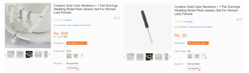 图示中商品变量中有和主商品完全不同的材料和产品,价格差距也非常大,易误导消费者,或让消费产生错误订单