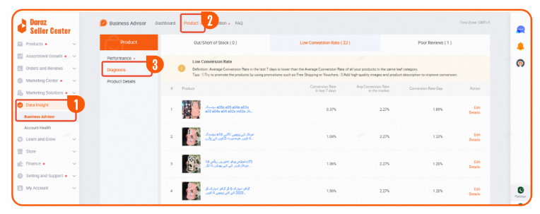 1 ► 进入卖家后台> Data Insight > Business Advisor > Product > Diagnosis 页面,根据指引优化现有在线商品。比如您可在 Low Conversion Rate 板块, 查看当前店铺低转化率的商品进行优化,或选择性下架替换为有潜力的新商品。